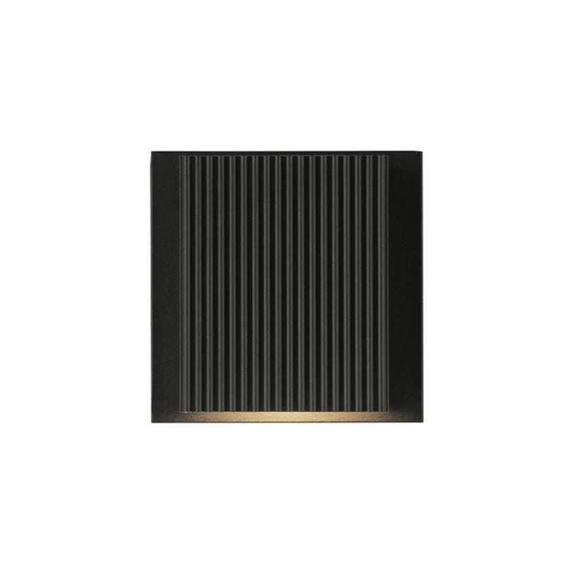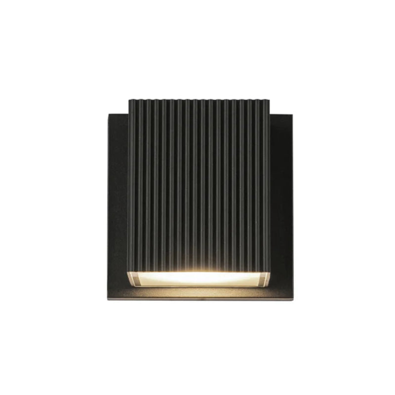 Providing downlight, this exterior wall sconce is simple and small. A black or white powder coated cube is attached to the square matching backplate with concealed fasteners. Light exits from its one end whether it is mounted horizontally or vertically. A linear pin-strip patterning adds interest to the front of the cube.