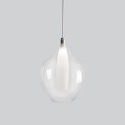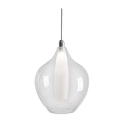 Simplistic elegant single LED pendant with a round drop clear outer glass and frosted inner glass set together as one piece. New patent pending socket design and Kuzco SSL wire allow this fixture to be 120V AC LED. Metal details in chrome finish. Available in three different glass styled single pendants and a variety of multi-pendant options, see series for full details.