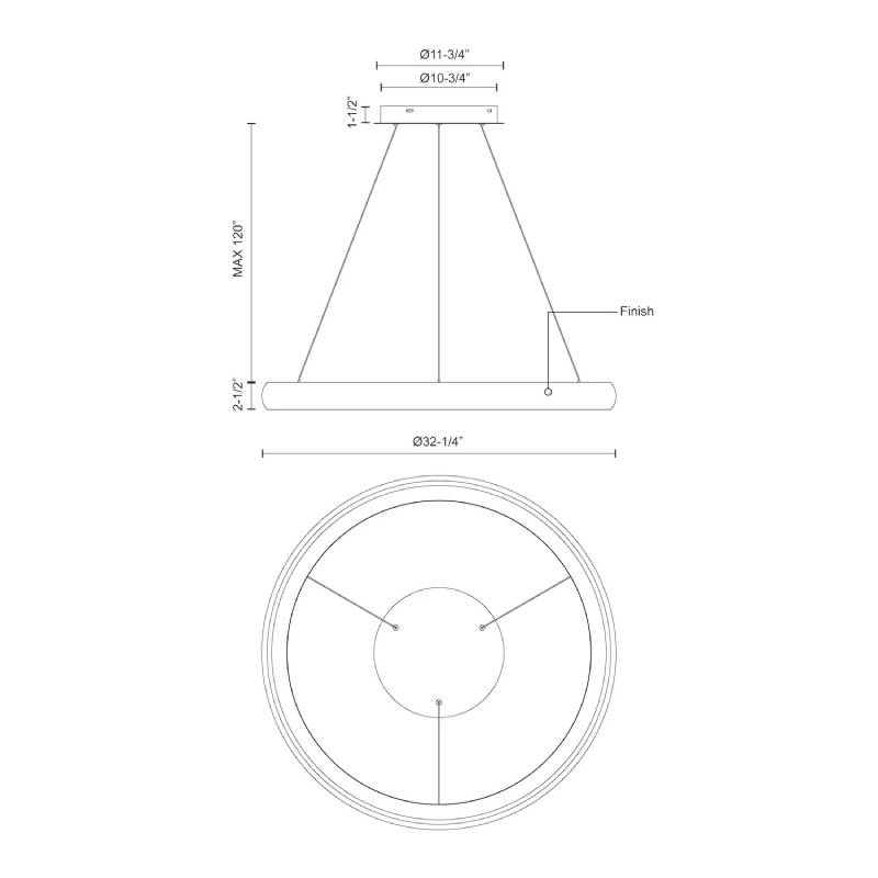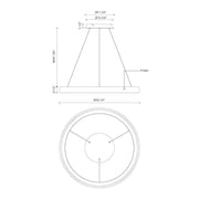 A curved band of powder-coated aluminum arcs around a central void forming and encapsulating an illuminated ring. Held within the perimeter structure of the CORTANA pendant is a circumferential LED light array spreading uniform radiance via the polymeric diffuser loop.