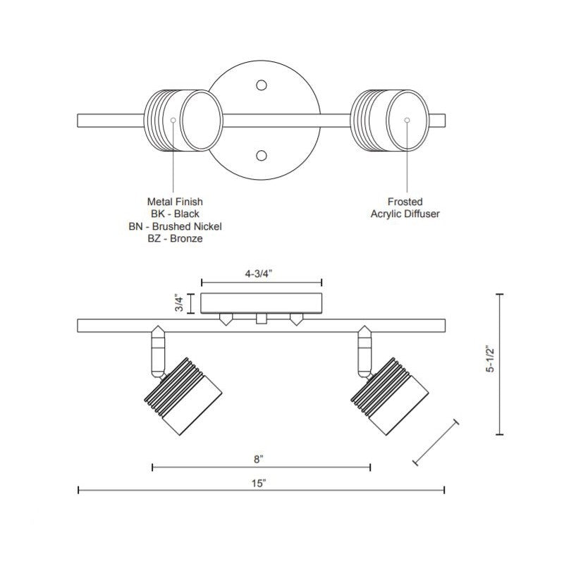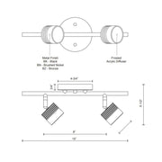 Modern LED fixed track fixture with two die cast aluminum heads and frosted glass diffusers. Each head rotates horizontally 360 degrees and pivots vertically 90 degrees allowing the lights to be directed to any desired angle.