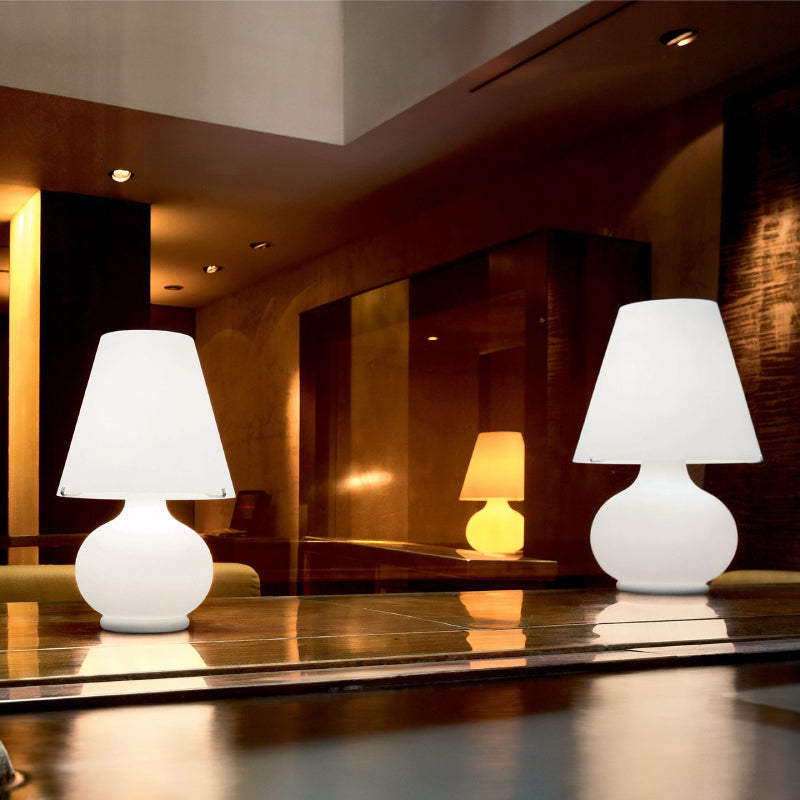 Designed by Leucos Design Lab, Paralume is a table lamp composed of two illuminating glass elements, the base, and the shade, that can be lighted up simultaneously or one at the time. Both the base and the shade are made of handblown “incamiciato” (Italian for “jacketed” or “layered”) glass that can each be illuminated. Incamiciato is a Venetian glass blowing technique where a Maestro glass blower uses multiple layers of glass each of different transparencies and properties, to create a rich satin white finish and provides perfect diffused light.