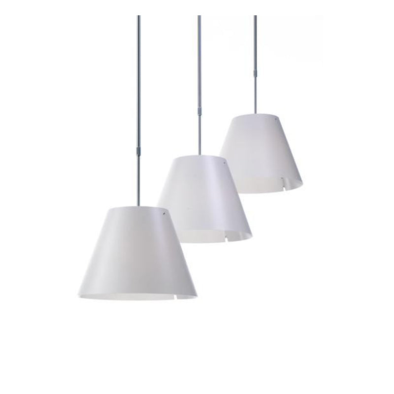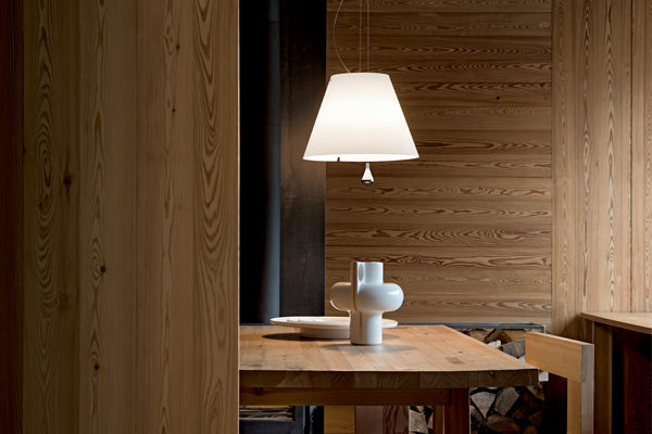 Elegant and light, this lamp emits a pleasant warm light through a silk-screened polycarbonate shade. The lamp’s height may be adjusted by means of a characteristic stainless steel counterweight.