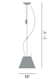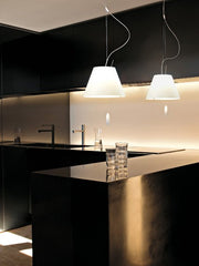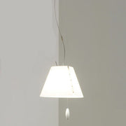 The coloured polycarbonate lampshade illuminates with character any room in which it is supsended. The lamp is turned on by means of a rod switch placed next to the source of light. The height is adjusted by means of a zamak counterweight.