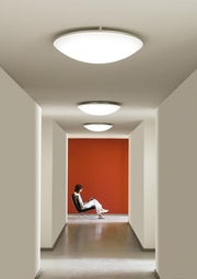 A neoclassic sense of equilibrium for a modern lamp. The shape and silk-screening of the polycarbonate diffuser allow intense and uniform light to be emitted. The handy system of magnetic hinges allows the lamp to be opened easily for any maintenance operation to be carried out.