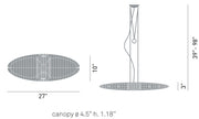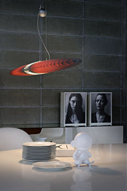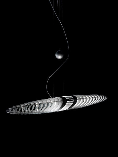 Light and versatile, the use of a pair of polycarbonate filters allows this lamp to change colour without interfering with the emission of white light. The complex aluminium rib assembly solution reflects light through a transparent and surprising shape. A spherical counterweight allows the lamp to be adjusted in height.