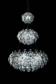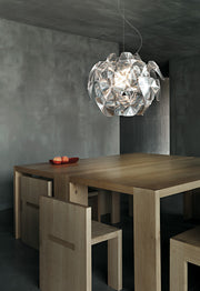 Incredibly light and easy to dismantle, Hope presents the magic of traditional chandeliers, reinterpreting them with sophisticated modern technologies and contemporary materials. A series of thin polycarbonate Fresnel lenses multiply the light from the light source, recreating a pleasant, glittery and party-like atmosphere, sprinkled with thousands of tiny reflections.