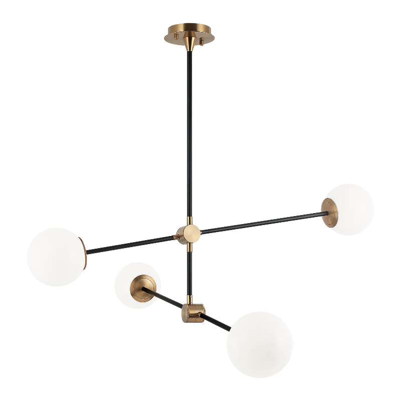 Cosmic is arranged with long, sleek, black rotatable rods, paired with Aged Gold Brass finish details. This collection is available in 3 sizes in either Clear or Opal glass to provide a stunning yet minimalistic look. The creativity of this series adds a unique detail to any space.