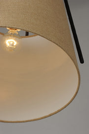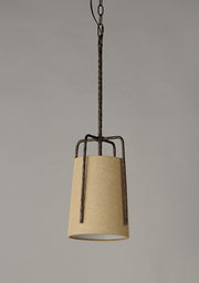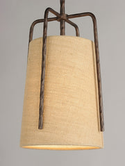 Rustic pendants of hammered iron finished in Oil Rubbed Bronze embraces a shade of Burlap fabric to create a casually comfortable appeal.