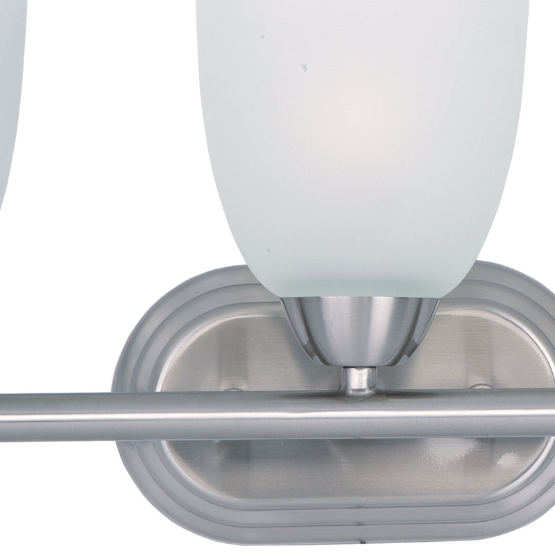 This transitional design works in any style home. Intersecting, rectangular tubing finished in your choice of Satin Nickel or Oil Rubbed Bronze gently curves to support simple line Frost glass shades.