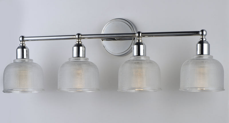 Crisp and clean define this new collection with Polished Chrome frames and Clear, prismatic shades. The geometric pattern of the glass diffuses the glare while providing ample light.