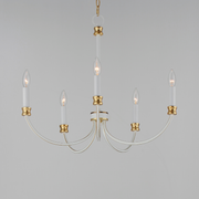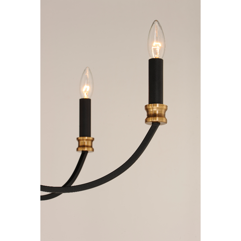 A lovely candelabra style collection with rich accents. This seemingly simple chandelier highlights classically curving accents in a stately combination of Black with Antique Brass accents or chic Weathered White with Gold Leaf accents. Taking a streamlined approach to the archetypal chandelier form, this series updates uses squared tubing to subtly modernize an approachable design with exposed candelabra lighting.