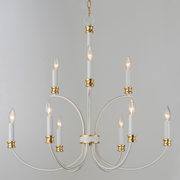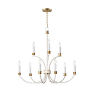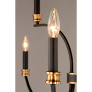 A lovely candelabra style collection with rich accents. This seemingly simple chandelier highlights classically curving accents in a stately combination of Black with Antique Brass accents or chic Weathered White with Gold Leaf accents. Taking a streamlined approach to the archetypal chandelier form, this series updates uses squared tubing to subtly modernize an approachable design with exposed candelabra lighting.
