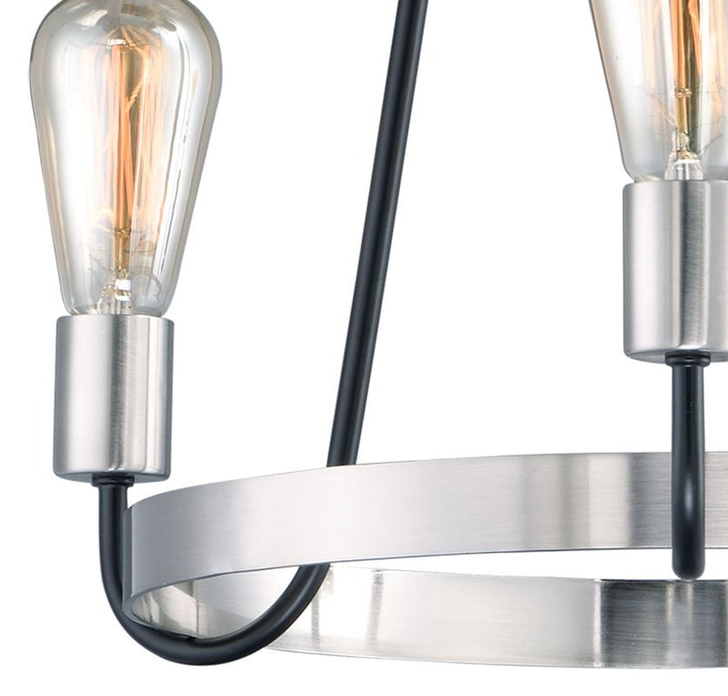 Arms that gracefully descend from a collector cradle a round metal band that can be removed for a minimalistic look. Available in two finish combinations: Black with Satin Nickel Accents and Oil Rubbed Bronze with Antique Brass accents.