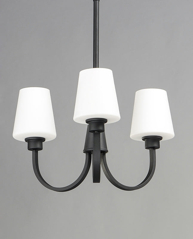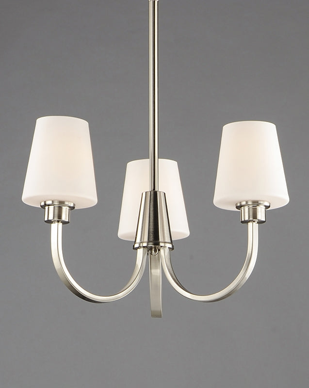 Graceful arcs of rectangular tubing transition to round cups that support tapered Satin White glass shades creating a crisp and clean transitional design. The frame is finished in your choice of Satin Nickel or Black which bridges modern and transitional design aesthetics.