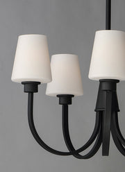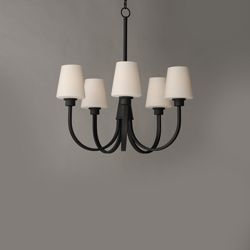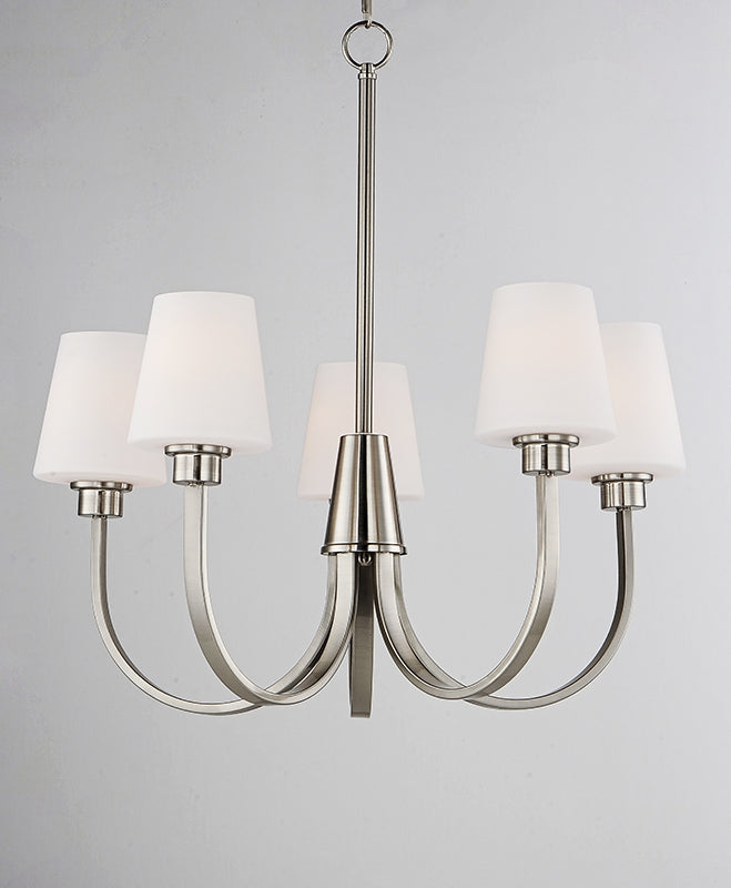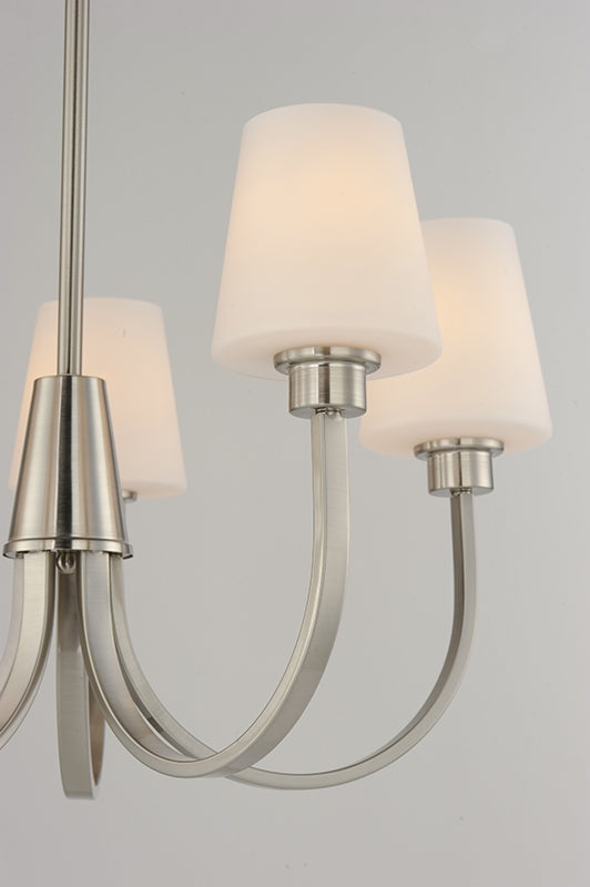 Graceful arcs of rectangular tubing transition to round cups that support tapered Satin White glass shades creating a crisp and clean transitional design. The frame is finished in your choice of Satin Nickel or Black which bridges modern and transitional design aesthetics.