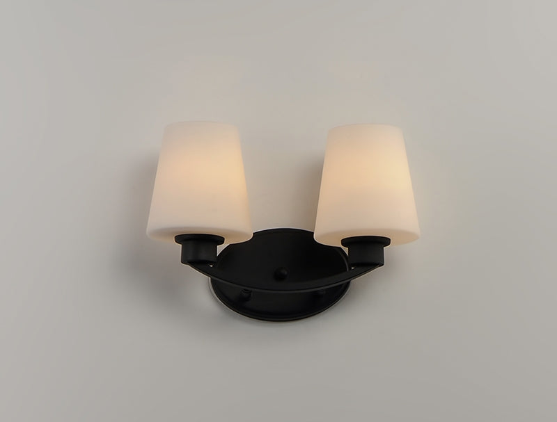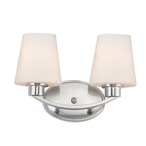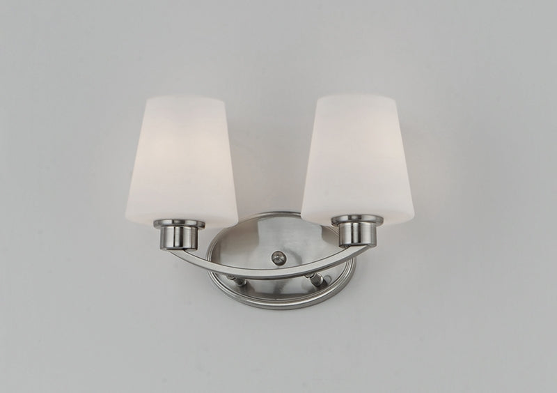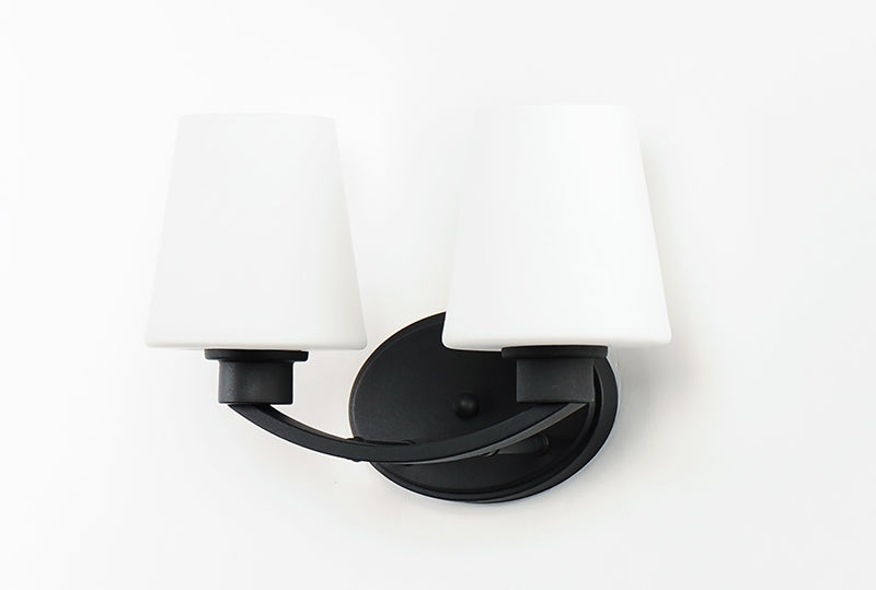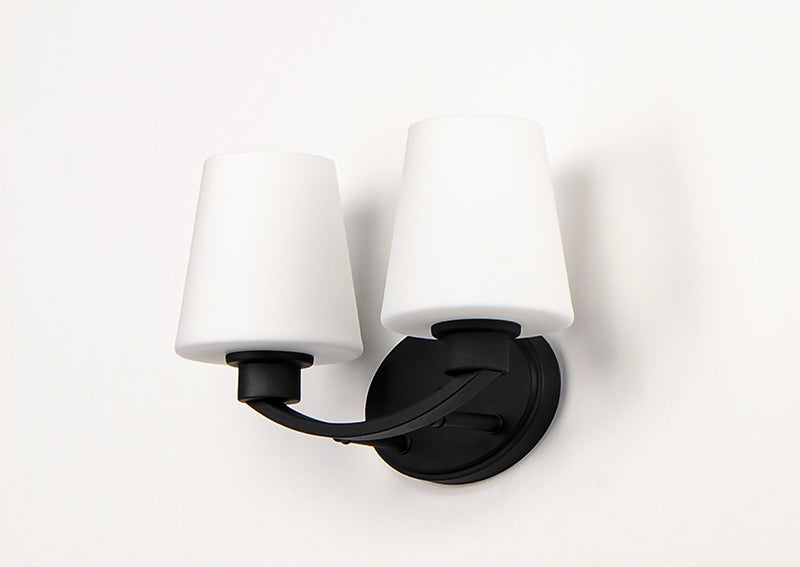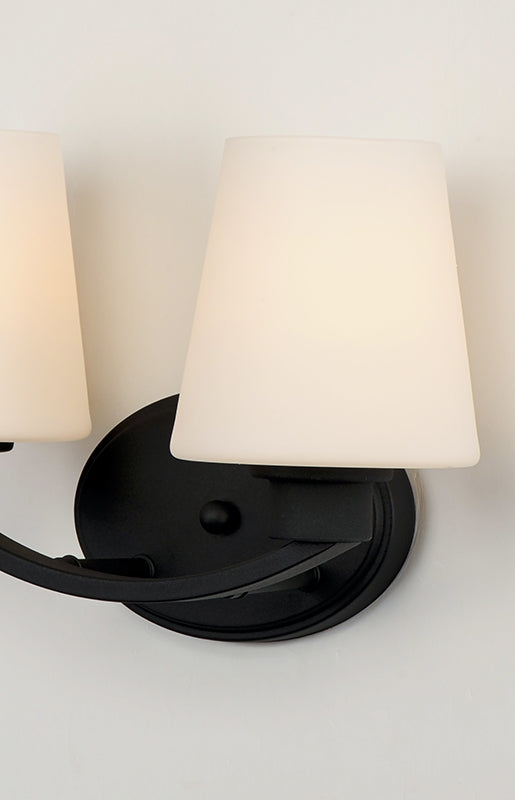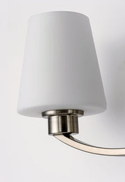 Graceful arcs of rectangular tubing transition to round cups that support tapered Satin White glass shades creating a crisp and clean transitional design. The frame is finished in your choice of Satin Nickel or Black which bridges modern and transitional design aesthetics.