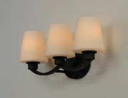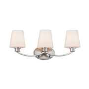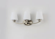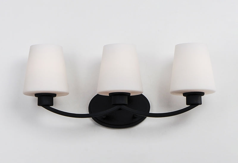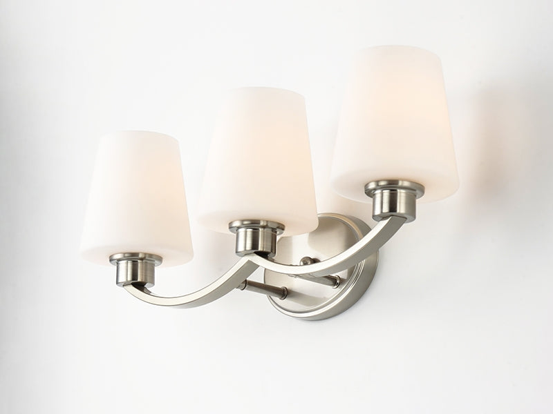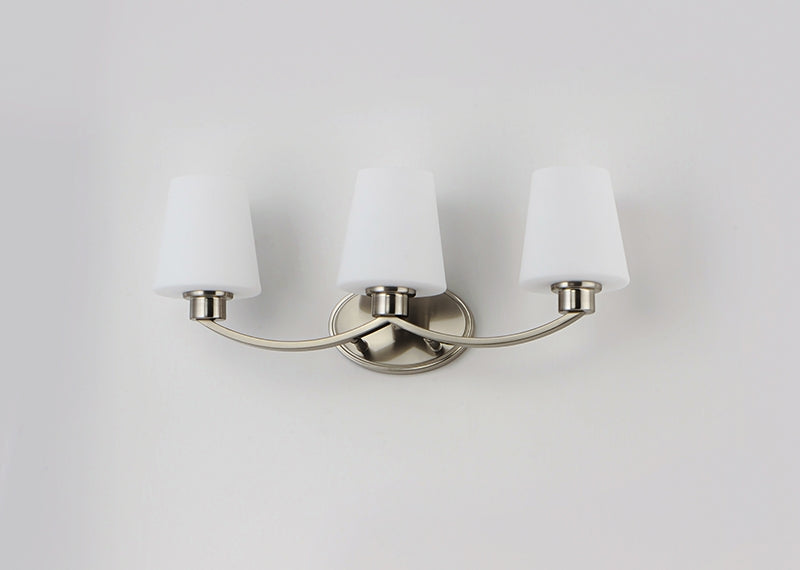 Graceful arcs of rectangular tubing transition to round cups that support tapered Satin White glass shades creating a crisp and clean transitional design. The frame is finished in your choice of Satin Nickel or Black which bridges modern and transitional design aesthetics.