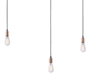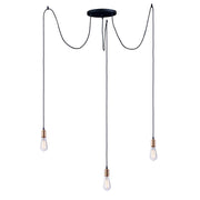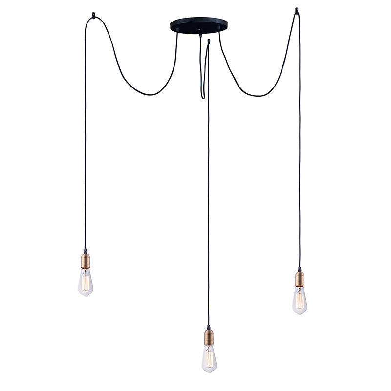 Cords of Black fabric support metal sockets finished in a natural Antique Brass allow you to create unique and fun lighting. All except the single pendant are supplied with hangers that attach to the ceiling to allow you to swag each socket. There are a number of optional bulbs to choose from.
