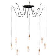 Cords of Black fabric support metal sockets finished in a natural Antique Brass allow you to create unique and fun lighting. All except the single pendant are supplied with hangers that attach to the ceiling to allow you to swag each socket. There are a number of optional bulbs to choose from.
