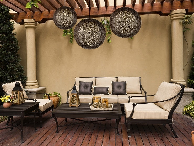 Spherical dual shades constructed of woven string in two tone finish combinations, Natural with White inner and Chocolate with White inner. Shades are treated for weather resistance and are U.L. approved for damp location which make them perfect for outdoor living spaces.