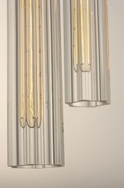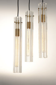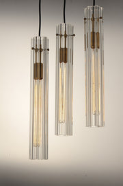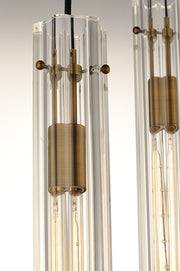 An exquisite collection featuring scalloped cylindrical Clear glass shades on unique metal frames finished in a combination of Black and Antique Brass. The cascading design of the chandeliers can be paired over a dining table or used as an entry fixture.