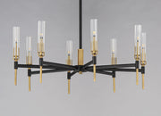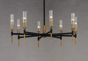An exquisite collection featuring scalloped cylindrical Clear glass shades on unique metal frames finished in a combination of Black and Antique Brass. The cascading design of the chandeliers can be paired over a dining table or used as an entry fixture.
