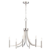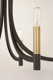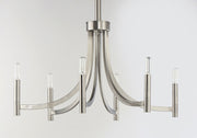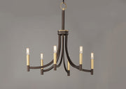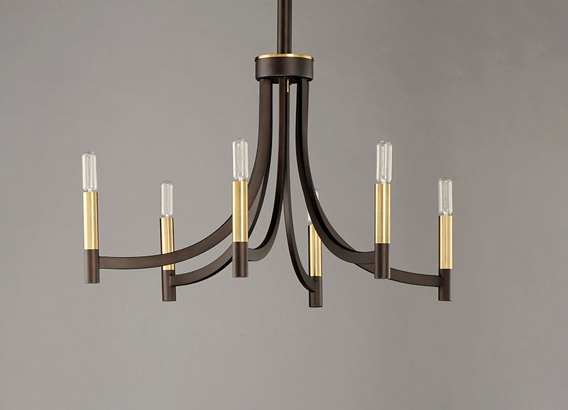 This transitional style chandelier collection features sweeping rectangular arms that transitions to a simple tubular candles. Available in Bronze with Antique Brass accents or all Satin Nickel for a more modern approach.