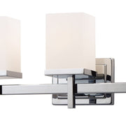 Square glass shades ride upon a rectangular bar to create geometry at its best. Available in Polished Chrome with Satin White glass and Satin Nickel and white Linen glass.