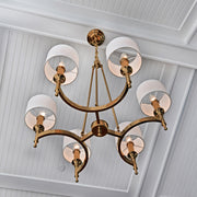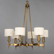 Arched channels of metal finished in your choice of Natural Aged Brass, form this minimalistic approach to traditional lighting. Oatmeal fabric shades adorn the top of metal candle covers that give this collection a tailored look.