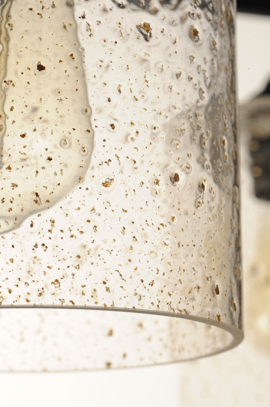 Stone Seeded glass shades with flecks of gold, suspend from a squared loop that cradles a rectangular tube arm finished in a soft Bronze. The minimalistic frame is a perfect complement to the rustic glamour of this glass.