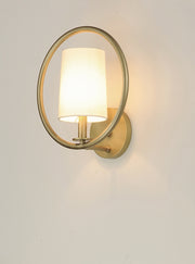 Heavy gauge rings are painted in Natural Aged Brass for a traditional approach to contemporary design. Nested in the center of each ring is a tall profile Off White fabric shade which casts soft light into the room and projects ample light to the surface below.