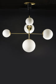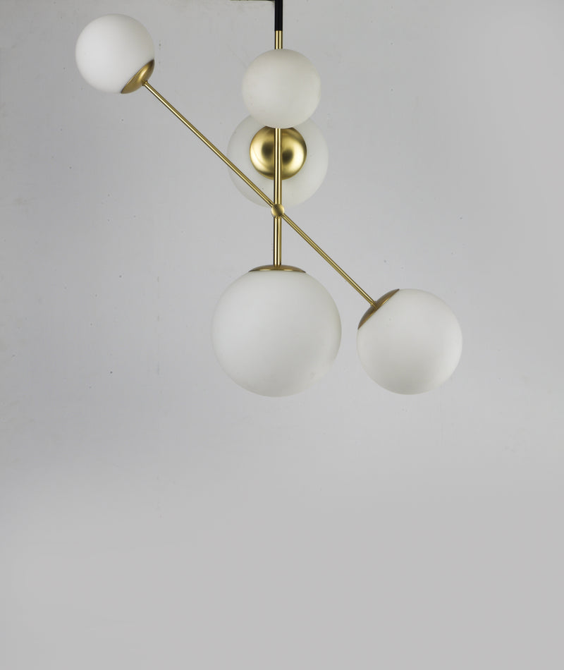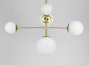 Inspired by both Mid Century Modern and Scandinavian Contemporary this collection spans a large breadth of today's interior design. Straight tubing finished in Satin Brass supports hand blown Satin White cased glass globes.