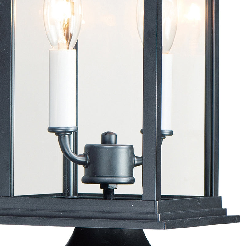 Inspired by classic coach gas lanterns, the Vicksburg collection features die-cast aluminum construction finished in Black with Clear glass. The candle sleeves are done in a contrasting off-white finish to add dimension to the lantern. Available in numerous sizes and configurations including a handsome pocket wall.