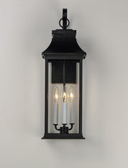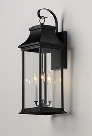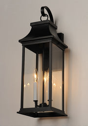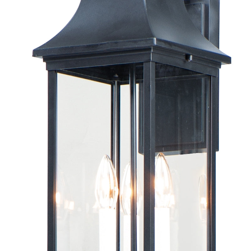 Inspired by classic coach gas lanterns, the Vicksburg collection features die-cast aluminum construction finished in Black with Clear glass. The candle sleeves are done in a contrasting off-white finish to add dimension to the lantern. Available in numerous sizes and configurations including a handsome pocket wall.