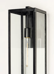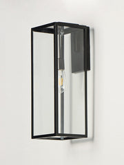 An elongated rectangular shaped design that is both minimalist and industrial. Die cast frames of Dark Bronze support Clear glass panels that provide an unobstructed view of the lantern's interior. Customize with your choice of lamps from vintage to tubular.