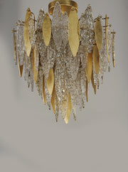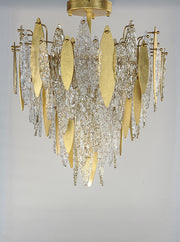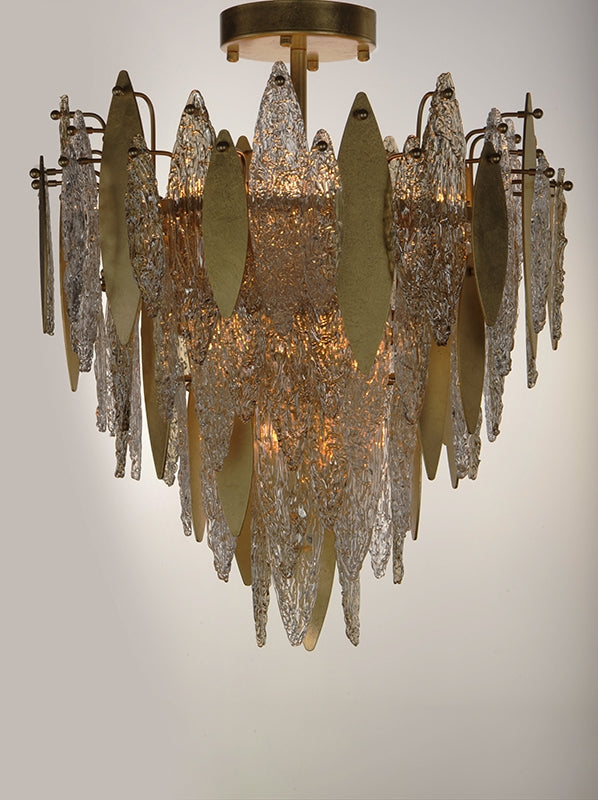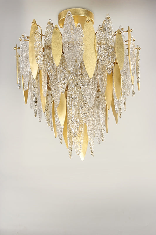 Hand-formed glass petals of Clear and Champagne-tint suspend from a tiered frame of gold and accented with petals of solid metal finished in Gold Leaf. Numerous candelabra sockets are strategically placed within the fixture to create glimmer and elegance to this majestic collection.