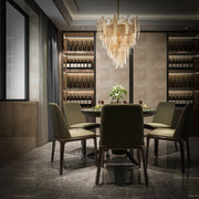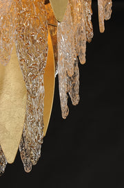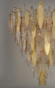 Hand-formed glass petals of Clear and Champagne-tint suspend from a tiered frame of gold and accented with petals of solid metal finished in Gold Leaf. Numerous candelabra sockets are strategically placed within the fixture to create glimmer and elegance to this majestic collection.