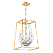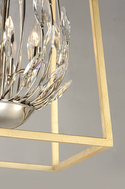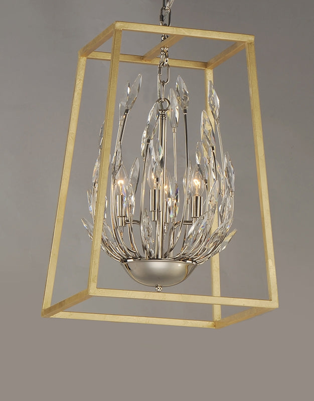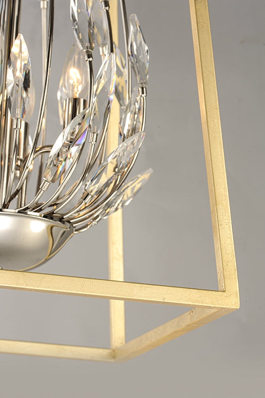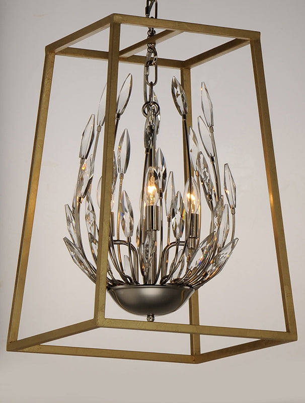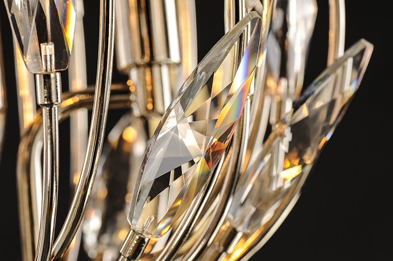 Metal frames finished in a lustrous Gold Leaf house a Polished Nickel bouquet of Beveled Crystal petals. The combination of gold, nickel, and crystal are dramatic elements that blend together in a homogenous fashion.