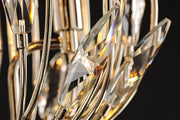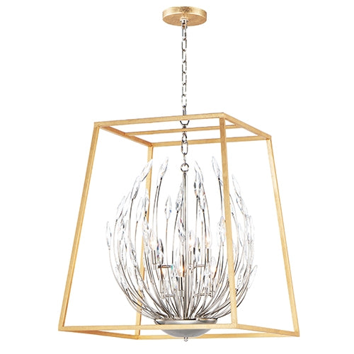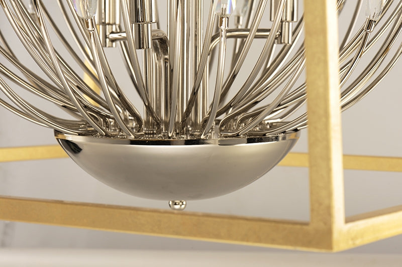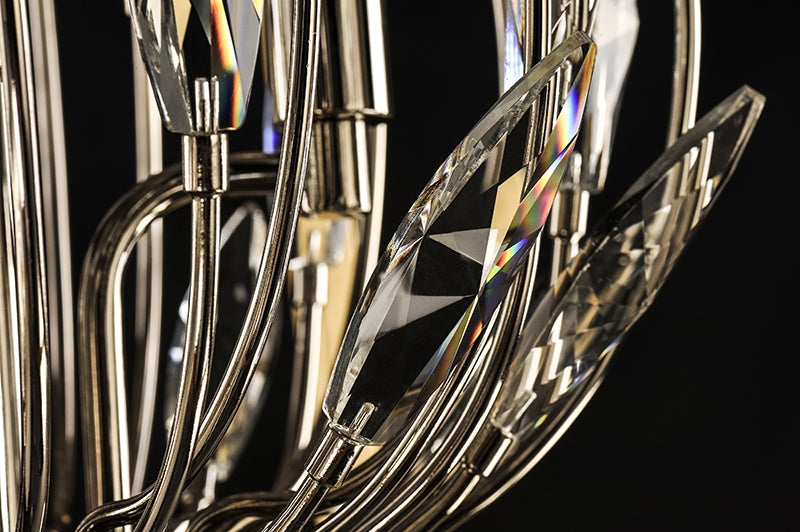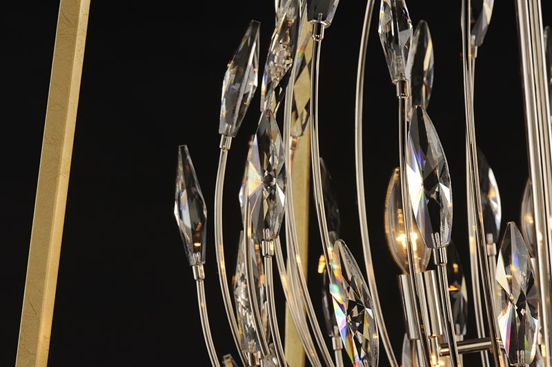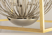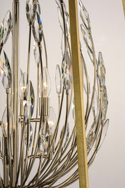 Metal frames finished in a lustrous Gold Leaf house a Polished Nickel bouquet of Beveled Crystal petals. The combination of gold, nickel, and crystal are dramatic elements that blend together in a homogenous fashion.