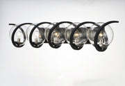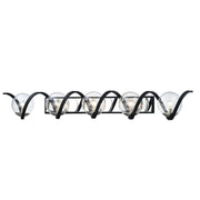 Rectangular metal channel, finished in Black, is meticulously formed in a curl design to create a unique and dramatic design. Clear Seedy glass balls supported by cups of Polished Nickel are strategically positioned to balance out the design.