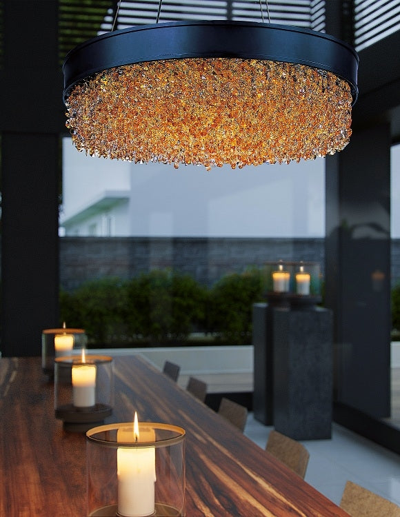 A sea of Scotch Crystal strands suspend from within drums of steel that are finished in a rich Bronze. Hidden inside the drums is a powerful dimmable LED source, which has the crystals dancing In the night without any glare in your eyes.