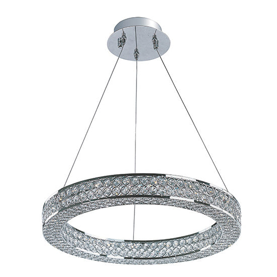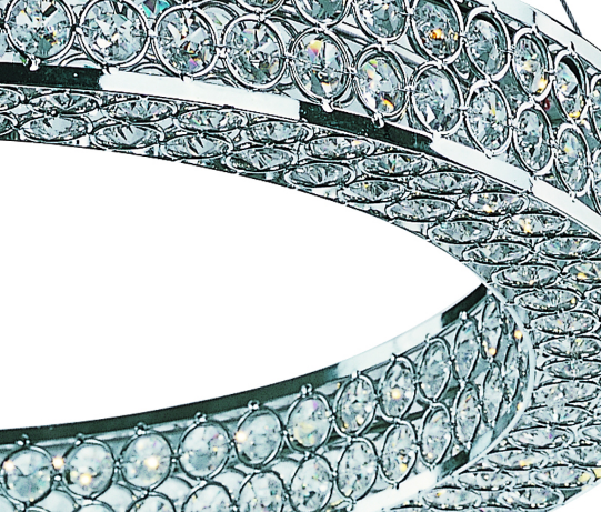 Frames of metal rings encased with Beveled Crystal Jewels, are finished in Polished Chrome. Suspended by cables as if floating In air, these rings cast rainbows of light when illuminated by the Integrated LED.