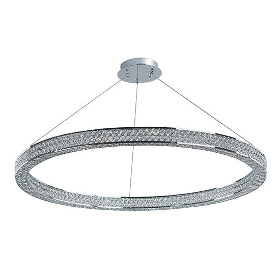 Frames of metal rings encased with Beveled Crystal Jewels, are finished in Polished Chrome. Suspended by cables as if floating In air, these rings cast rainbows of light when illuminated by the Integrated LED.