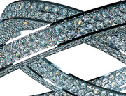 Frames of metal rings encased with Beveled Crystal Jewels, are finished in Polished Chrome. Suspended by cables as if floating In air, these rings cast rainbows of light when illuminated by the Integrated LED.