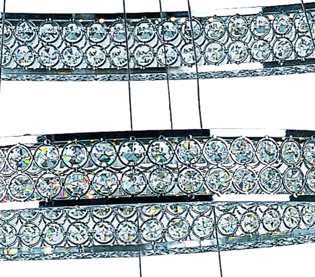Frames of metal rings encased with Beveled Crystal Jewels, are finished in Polished Chrome. Suspended by cables as if floating In air, these rings cast rainbows of light when illuminated by the Integrated LED.