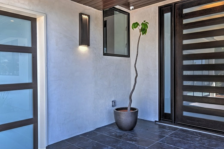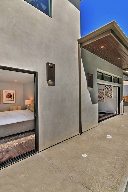 This great architectural outdoor design provides illumination from two places. A slash of light washes down the grated diffuser and out away from the wall while additional light is directed out the bottom straight down that washes the wall and illuminates the walkway below. Available In three sizes and finished in Architectural Bronze.