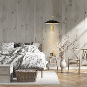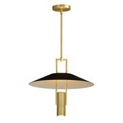 Updating a Mid Century classic, squared tubing supports an LED housing that shines light and a reflecting shade much more angular than the traditional reflecting up-light shaded pendant.
