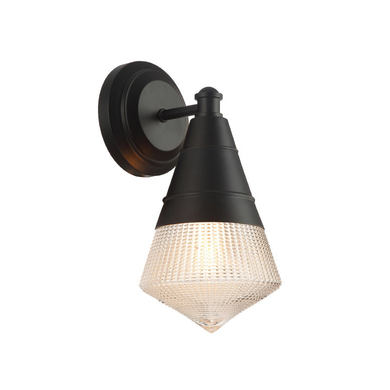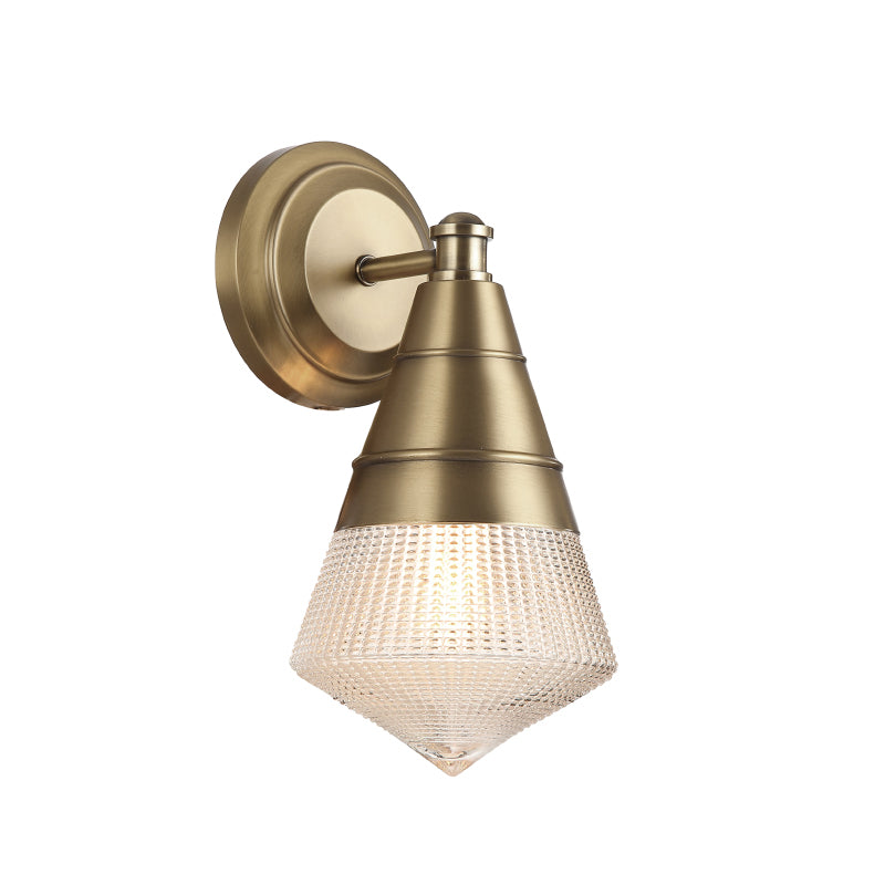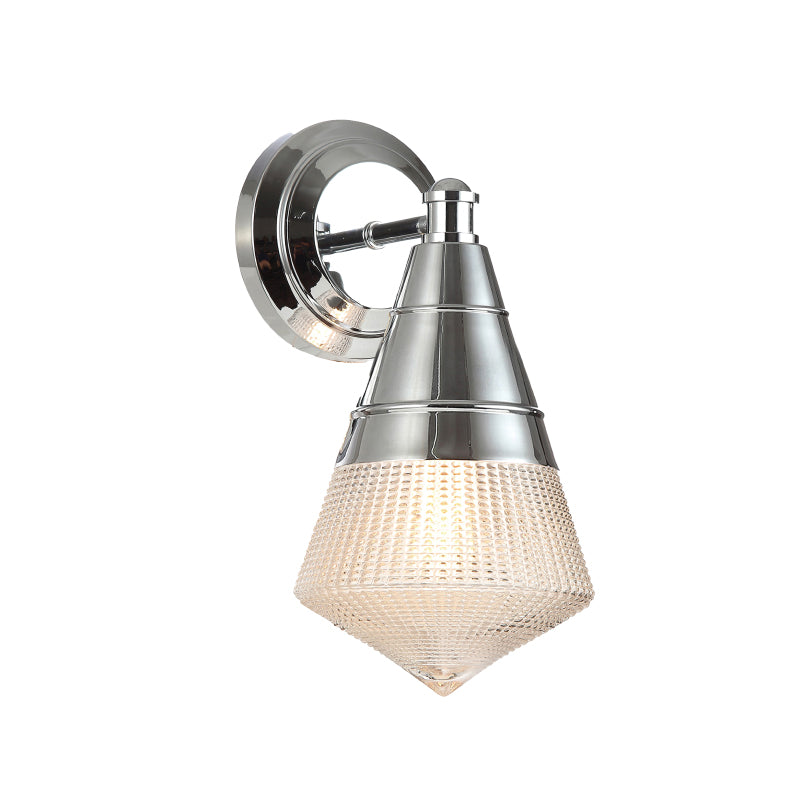 A prismatic diffusion of light is housed within pressed cone glass shades. Choose from pendants with tapered metal halves that conceal the light source or glass shades that are supported by a metal ring. Coordinating bath vanity lights complete the collection.