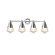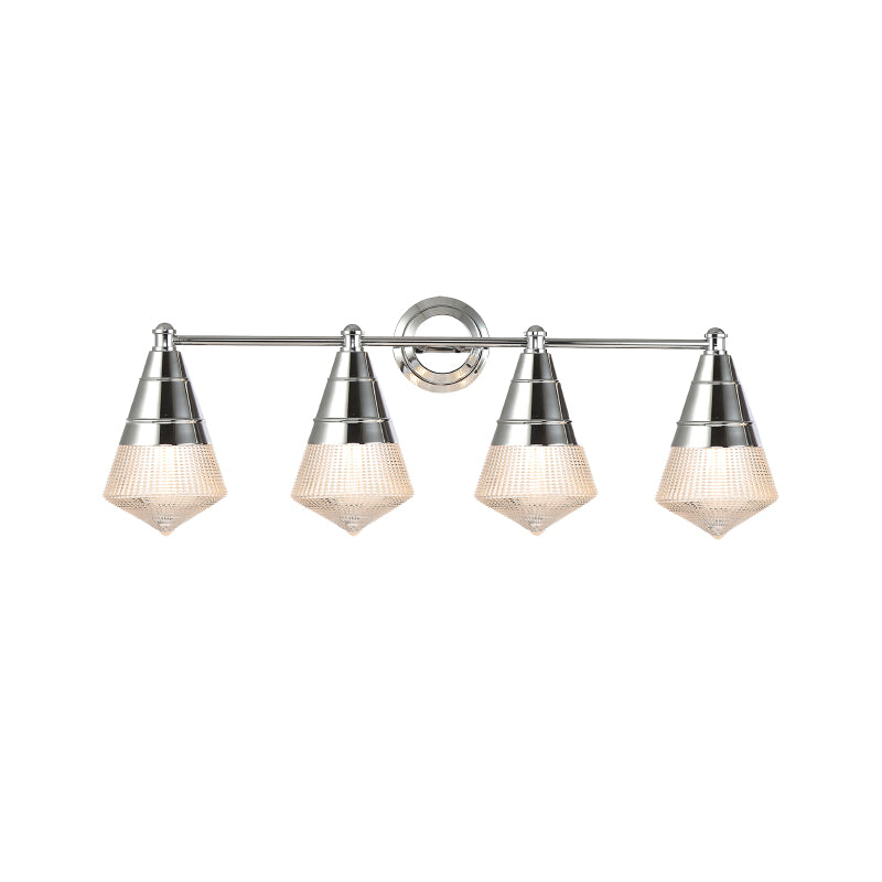 A prismatic diffusion of light is housed within pressed cone glass shades. Choose from pendants with tapered metal halves that conceal the light source or glass shades that are supported by a metal ring. Coordinating bath vanity lights complete the collection.