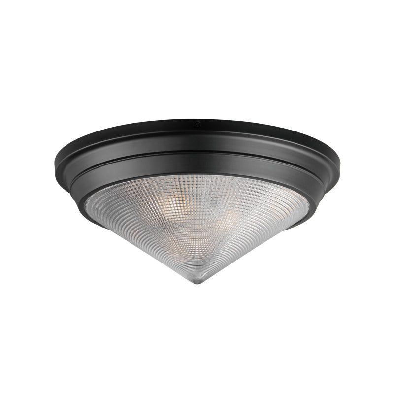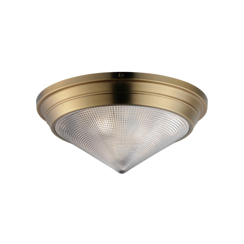 A prismatic diffusion of light is housed within pressed cone glass shades. Choose from pendants with tapered metal halves that conceal the light source or glass shades that are supported by a metal ring. Coordinating bath vanity lights complete the collection.